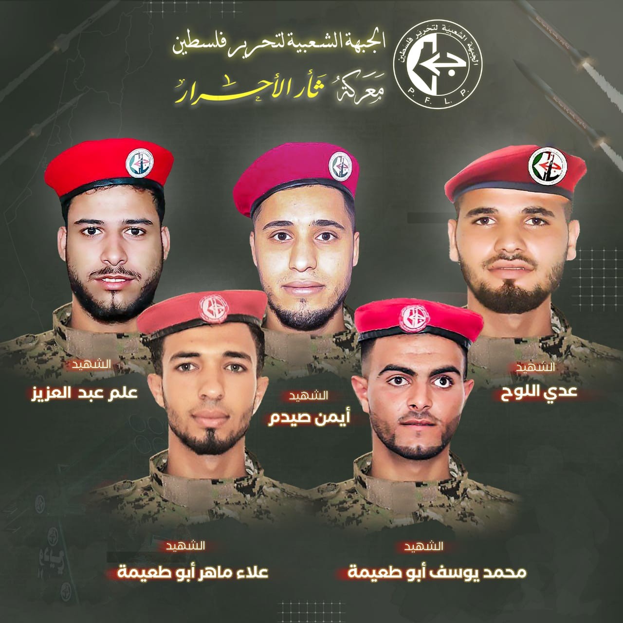 وجاء في البرقية لليسار الثوري: نتقدم باسم جميع كوادر اليسار ومناضليه وأصدقائه على أرض سوريا وفي كل مواقع اللجوء والشتات، بتعازيه الرفاقية وتضامنه مع كتائب الشهيد أبو علي مصطفى ومع كل أبناء المقاومة و دعاة التحرر في العالم باستشهاد ثلة من مقاتليها الأبطال من وحدتي الصاروخية والمدفعية خلال تأديتهم لواجبهم الوطني خلال عملية “ثأر الأحرار” لدماء الشهداء رداً على جرائم الاحتلال الاستيطاني بعد استهداف صهيوني جبان وهم :