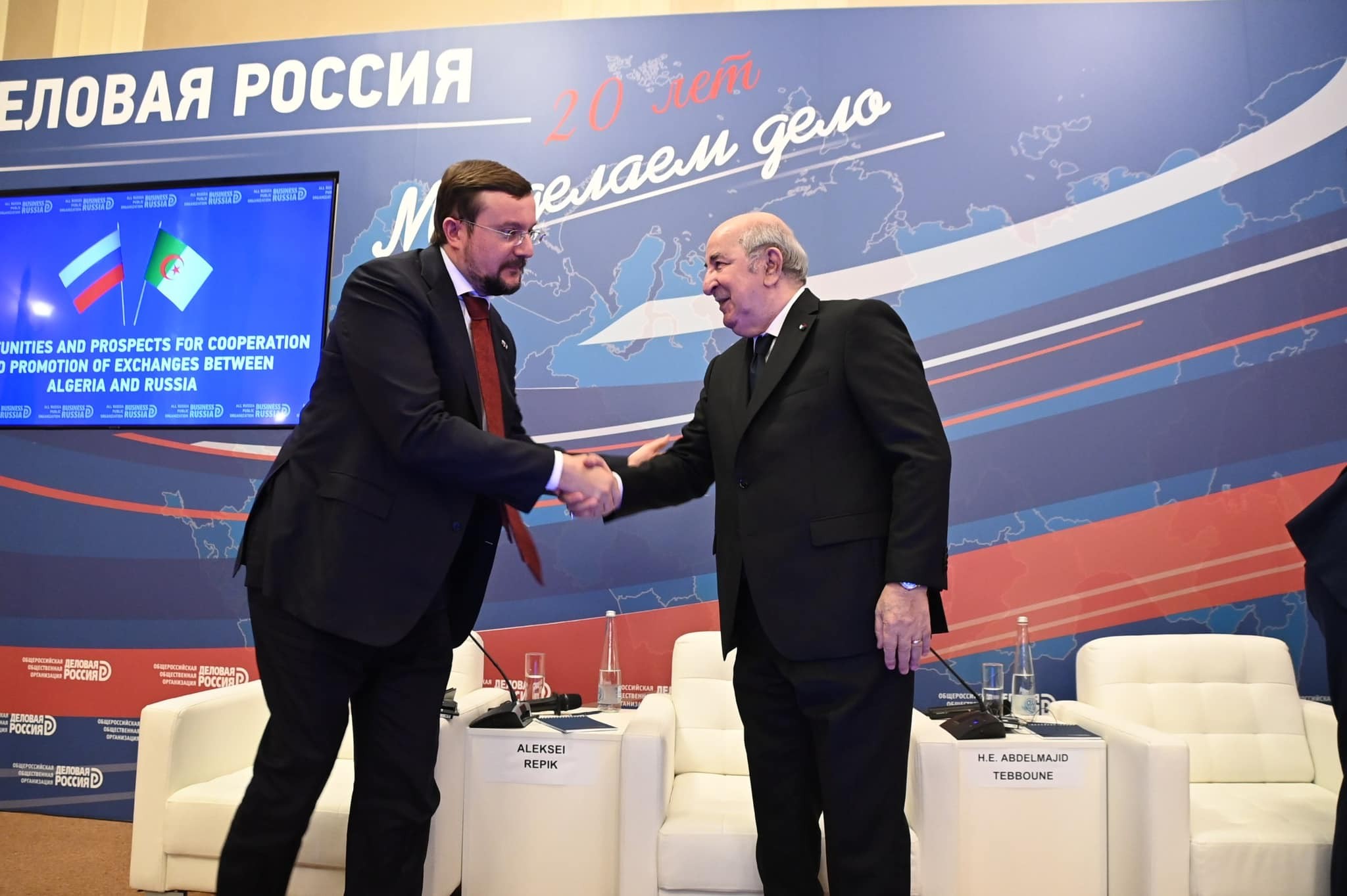 وأشرف الرئيس تبون على افتتاح أشغال المنتدى الاقتصادي الجزائري-الروسي الذي يشارك فيه 70 متعاملاً اقتصادياً جزائرياً و 200 رجل أعمال روسي، من أجل بحث فرص الاستثمار والشراكة بين البلدين، وتعزيز التعاون بينهما، وإعطاء دفع قوي للعلاقات الاقتصادية بين البلدين.