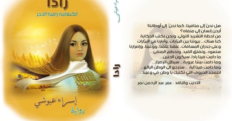 صدر حديثاً رواية «رادا» للأديبة الفلسطينية إسراء عبوشي؛ الروائية الفائزة بجائزة الاستحقاق لجوائز ناجي نعمان الأدبية الدوليّة عام 2021م في لبنان. وتقع الرواية في 106 صفحة من القطع المتوسط، تدقيق أ. عمر عبد الرحمن نمر وأ. عبد الكريم أبو جابر | فلسطين، تصميم الغلاف: وفاء صلاح |مصر، لوحة الغلاف للفنان الفلسطيني: عماد أبو شتية | الأردن