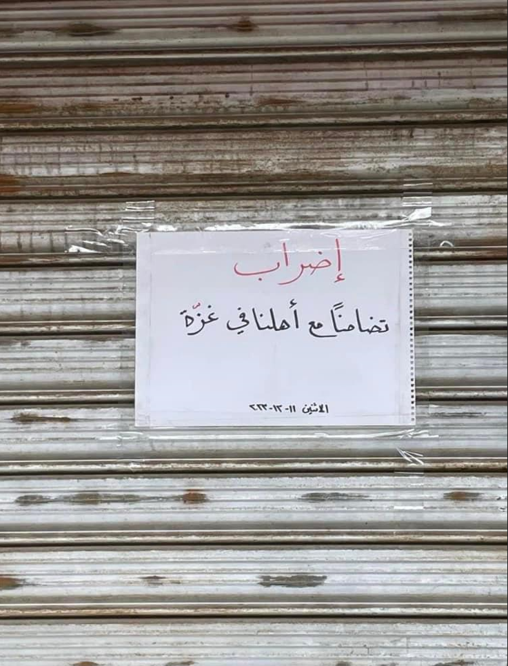 عمّ الإضراب الشامل محافظات الوطن، اليوم الإثنين، تنديدًا بالعدوان الصهيوني المتواصل على شعبنا في قطاع غزة والضفة، لليوم الـ66 على التوالي، وللمطالبة بوقف المجازر البشعة وقصف منازل المواطنين الآمنين والمستشفيات ومراكز الإيواء.