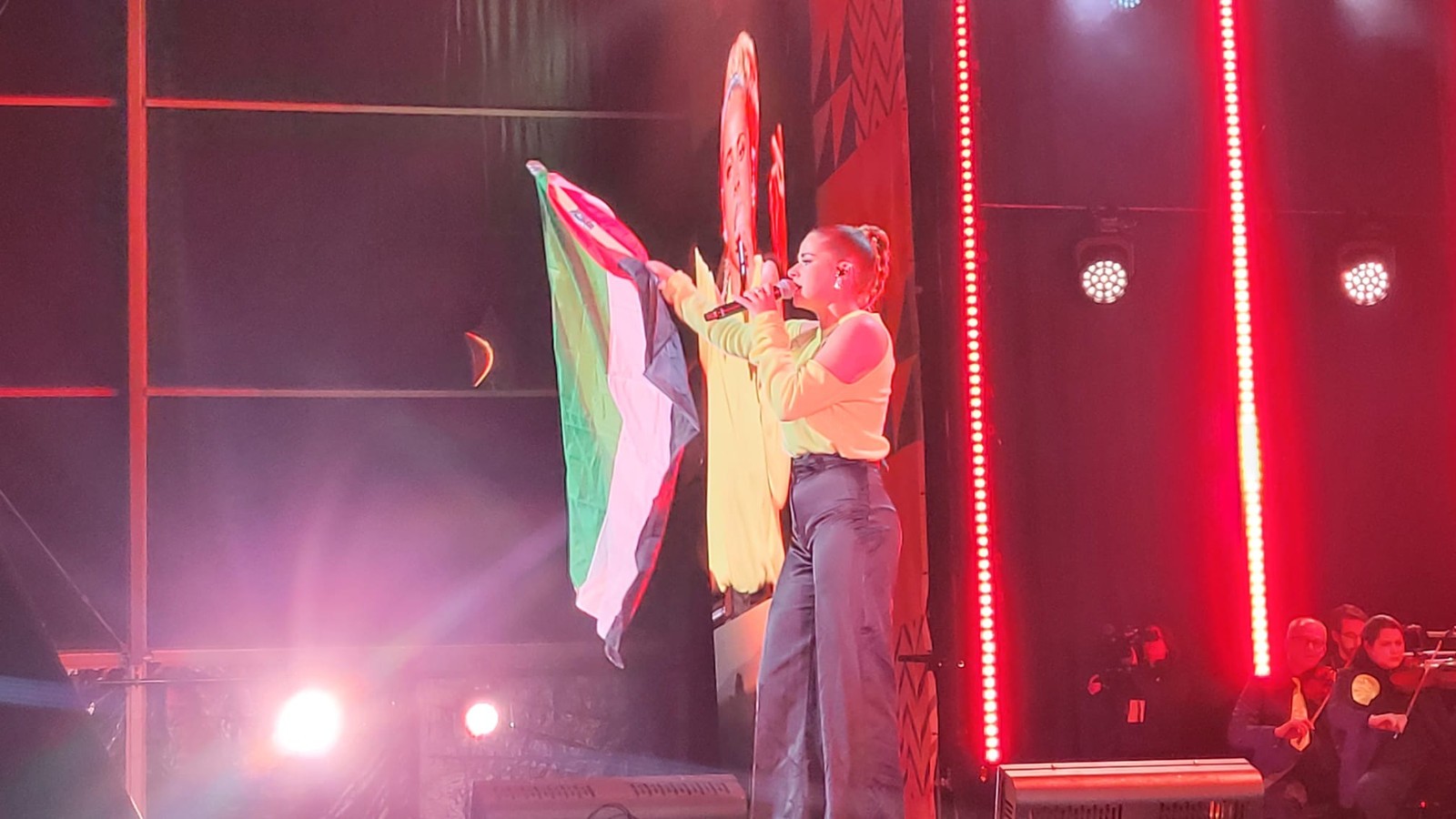 وعند استئناف الحفل خرجت المغنية البلجيكية لاورا ديستورسو للجماهير تنادي بالحرية لفلسطين ورفعت العلم الفلسطيني خلال غنائها.