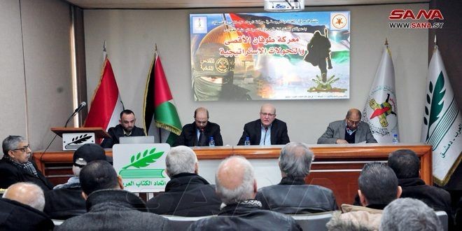 تحت عنوان آثار معركة طوفان الأقصى على الكيان الإسرائيلي محلياً وإقليمياً ودولياً، أقام اتحاد الكتاب العرب ندوة سياسية تحدث فيها الرفيق أبو علي حسن عن موقع ومكانة معركة طوفان الأقصى في الفكر السياسي المقاوم، باعتبارها فعل مقاوم ارتقائي ولحظة سياسية فارقة، فهي معركة الشعب الفلسطيني ككل، مشيراً إلى أن طبيعة هذه المعركة تنتمي إلى مسار الصراع المفتوح مع الكيان.