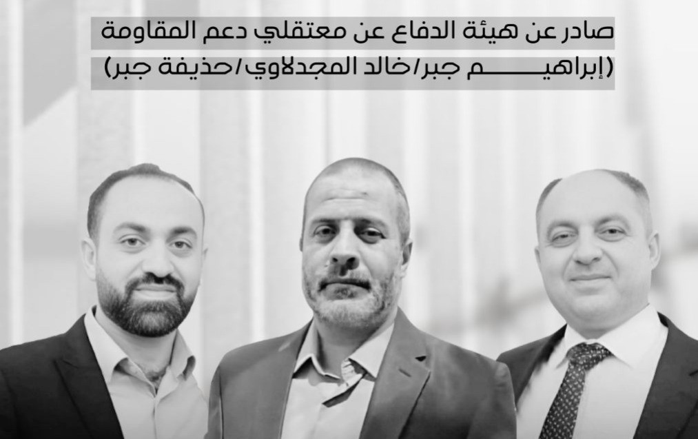 أصدرت هيئة الدفاع عن معتقلي دعم المقاومة بياناً يدعو إلى إخلاء سبيل المعتقلين الثلاثة إبراهيم إبراهيم جبر وحذيفة جبر وخالد المجدلاوي، والتجاوب مع الوساطات السياسية لإغلاق الملف لأبعاده السياسية، ويواجه المعتقلين الثلاثة تهم بزعم محاولة تزويد المقاومة الفلسطينية في شمال الضفة الغربية بالسلاح ويجري محاكمتهم سندًا لنصوص قانون منع الإرهاب الأردني، وقد بدأت محاكمتهم بعد أكثر من عام على اعتقالهم ولا تزال المحاكمة مستمرة حتى الآن. حيث أنهم موقوفين منذ منتصف العام ٢٠٢٣.