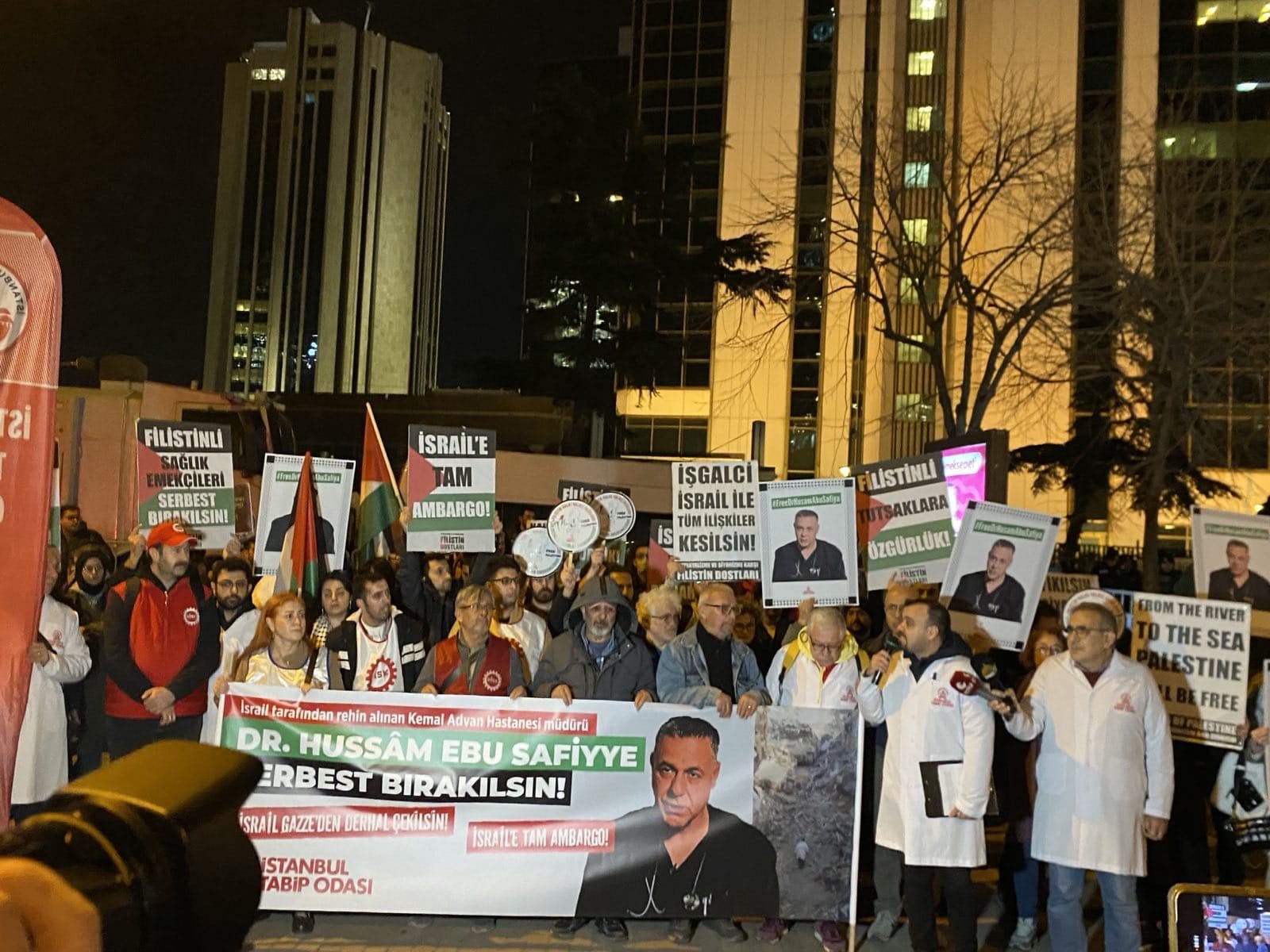 وقد جاء في البيان الصحفي الذي قرأه رئيس الغرفة أمام القنصلية، والذي طالب بالإفراج الفوري عن الدكتور حسام أبو صفية "لهذا السبب، نحن كغرفة أطباء إسطنبول مع جميع أصدقاء فلسطين هنا نعلن أننا سنبذل قصارى جهدنا من أجل تحرير فلسطين وإنهاء فظائع إسرائيل وانسحابها من غزة، وإطلاق سراح جميع الأسرى المحتجزين لدى إسرائيل وخاصة الدكتور حسام، وذلك بالضغط من أجل فرض حظر حقيقي على دولة الاحتلال في جميع المجالات وخاصة الاقتصادية".