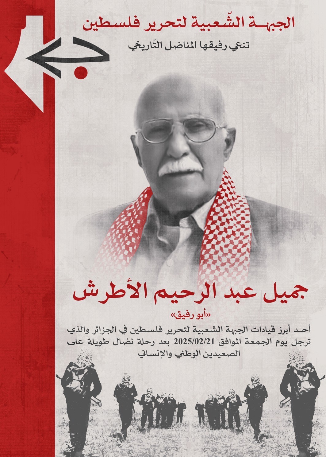 نعت الجبهة الشعبية لتحرير فلسطين بمزيد من الحزن والأسى رفيقها المناضل التاريخي "جميل عبد الرحيم الأطرش" "أبو رفيق" (79 عاماً)، والذي رحل في الجزائر، بعد رحلة نضال طويلة على الصعيدين الوطني والإنساني.
