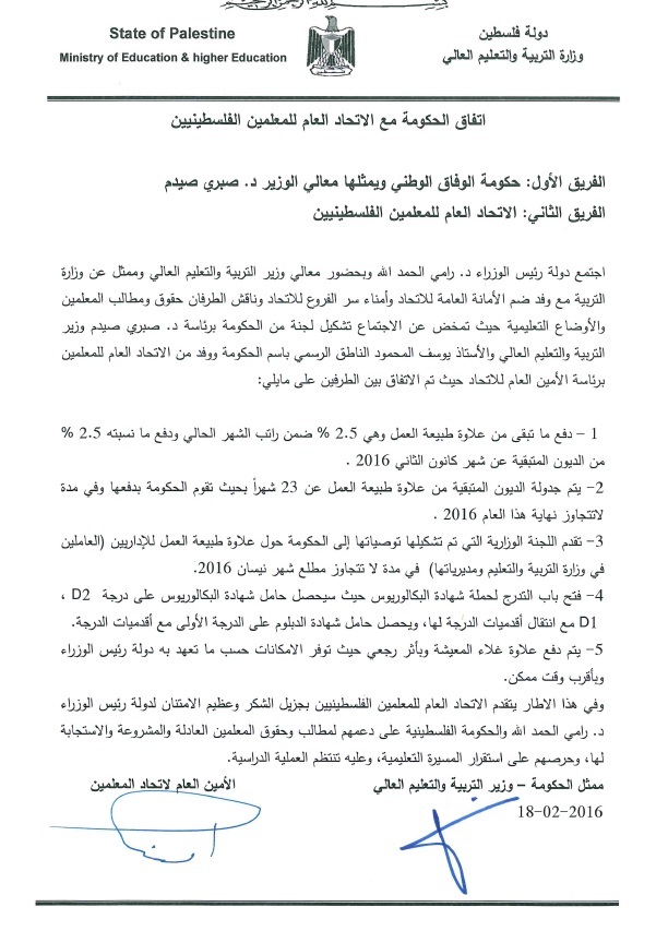 أعلنت الحكومة الفلسطينية، مساء الخميس، عن اتفاقٍ مع اتحاد المعلمين، يقضى بإنهاء المشاكل العالية، ويقوم على استئناف الدوام منذ يوم السبت.