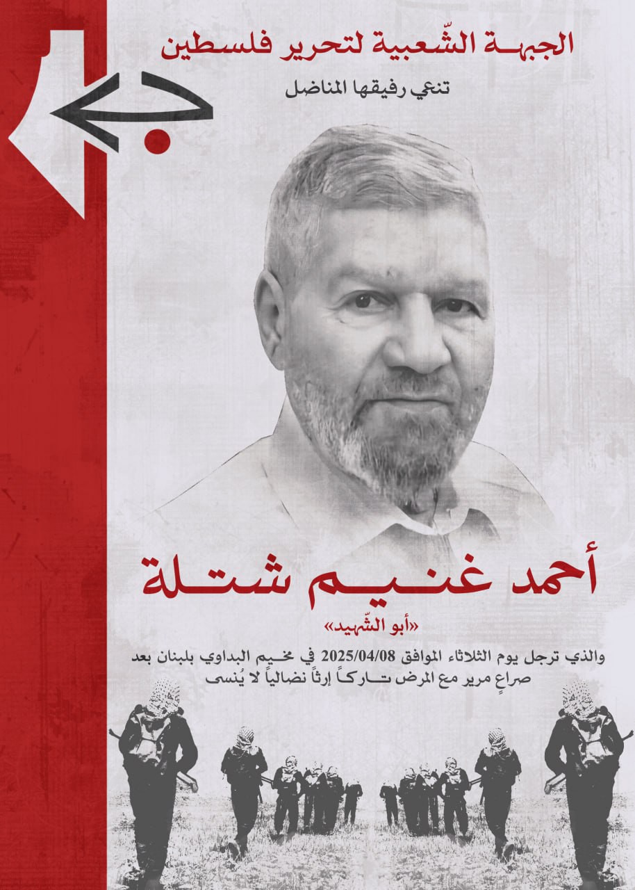 نعت الجبهة الشعبية لتحرير فلسطين رفيقها المناضل أحمد غنيم شتلة (أبو الشهيد) الذي رحل اليوم في مخيم البداوي بعد صراعٍ مرير مع المرض تاركاً إرثاً نضالياً لا يُنسى.