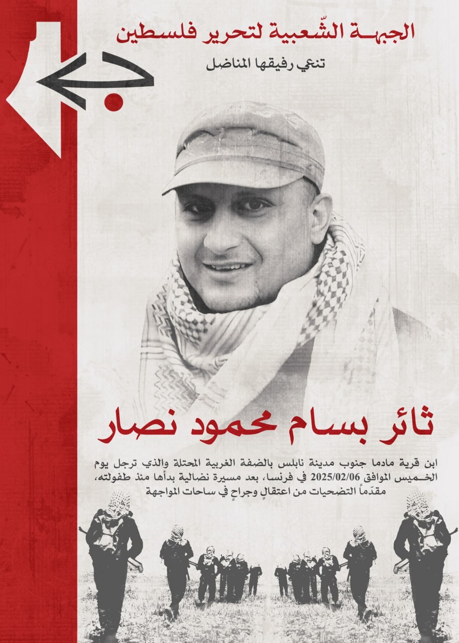 نعت الجبهة الشعبية لتحرير فلسطين الرفيق المناضل ثائر بسام محمود نصار، ابن قرية مادما جنوب نابلس، الذي رحل في فرنسا بتاريخ 6 شباط/ فبراير 2025، بعد مسيرة نضالية بدأها منذ طفولته، مقدّماً التضحيات من اعتقالٍ وجراحٍ في ساحات المواجهة.
