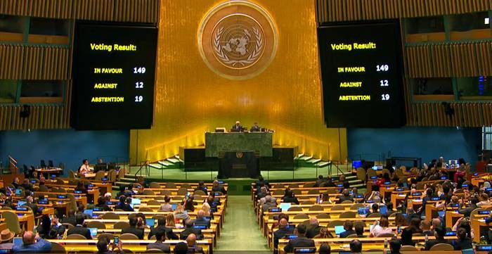مشروع القرار الذي قدمته 23 دولة إلى جانب فلسطين، وبقيادة إسبانيا، اعتمدته الجمعية العامة بأغلبية 149 عضوا ومعارضة 12 وامتناع 19 عن التصويت، خلال الجلسة الاستثنائية العاشرة للجمعية، وذلك بعد فشل مجلس الأمن في اعتماد قرار في الرابع من حزيران/ يونيو يدعو إلى وقف فوري ودائم لإطلاق النار في غزة، عقب استخدام الولايات المتحدة لحق النقض "الفيتو"، رغم أنه حظي بتصويت كافة أعضاء المجلس الآخرين.