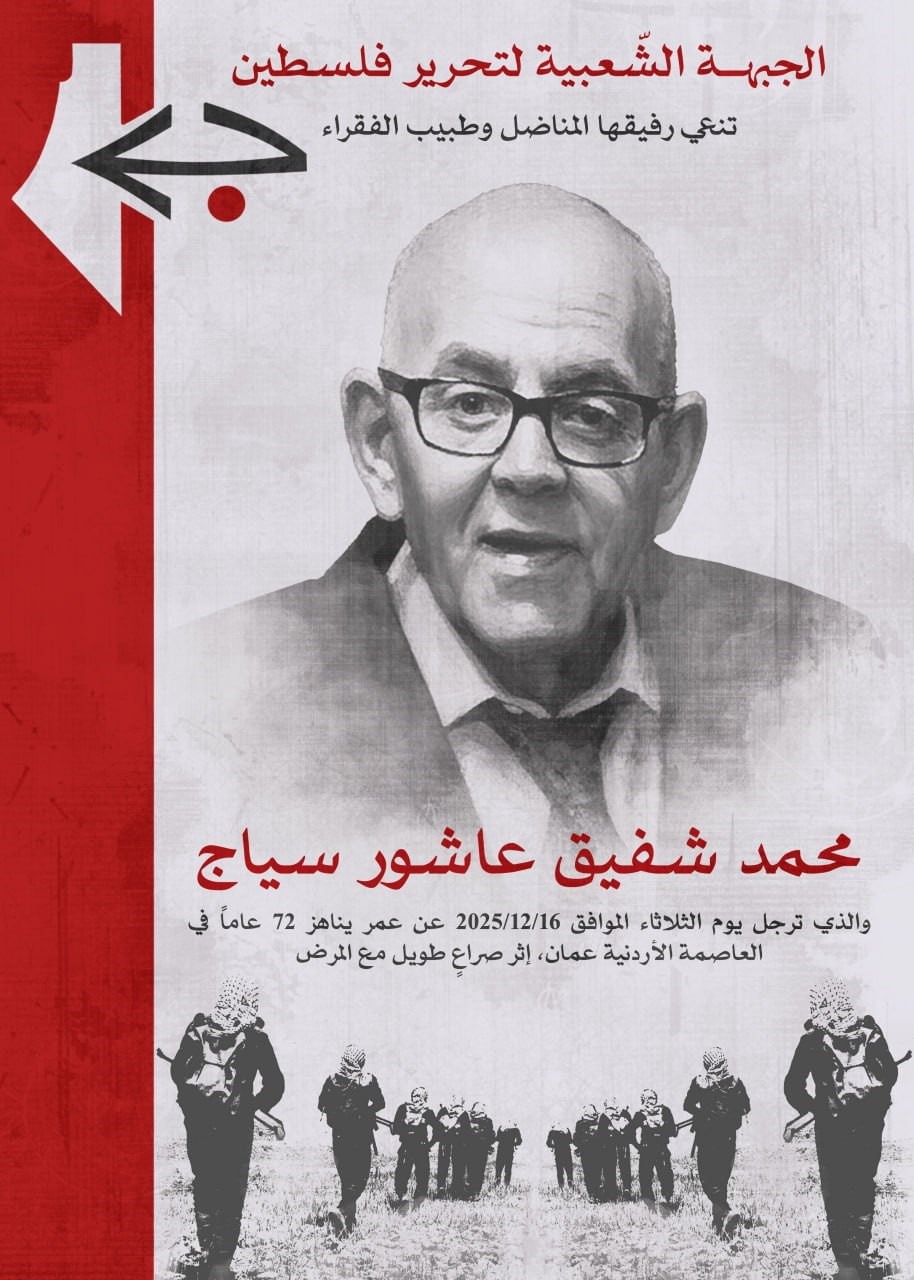 نعت الجبهة الشعبية لتحرير فلسطين ، باسم أمينها العام الرفيق أحمد سعدات، ونائبه الرفيق جميل مزهر، وأعضاء المكتب السياسي واللجنة المركزية، وكافة أعضائها وأنصارها في الوطن والشتات؛ رفيقها المناضل الدكتور محمد شفيق عاشور سياج، الذي تَرّجل أول أمس الموافق 16 ديسمبر/ كانون الأول 2025، عن عمر يناهز 72 عاماً في العاصمة الأردنية عمان، إثر صراعٍ طويل مع المرض.