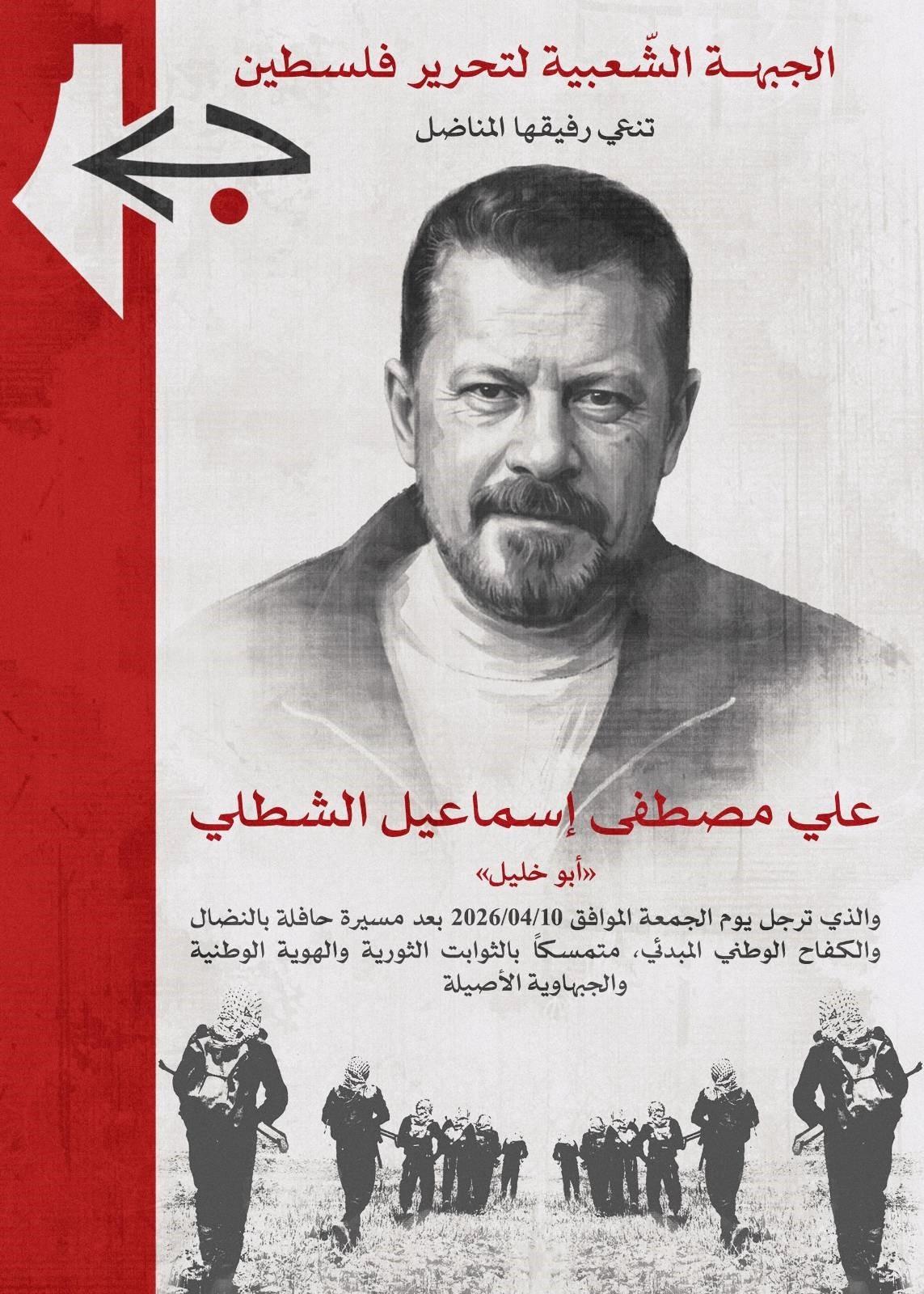نعت الجبهة الشعبية لتحرير فلسطين باسم أمينها العام ونائبه، وأعضاء المكتب السياسي واللجنة المركزية، وكافة كوادرها وأعضائها في الوطن والشتات، ببالغ الحزن والأسى، رفيقها المناضل: علي مصطفى إسماعيل الشطلي (أبو خليل) 62 عاماً، والذي ترجّل اليوم بعد مسيرة حافلة بالنضال والكفاح الوطني المبدئي، متمسكاً بالثوابت الثورية والهوية الوطنية والجبهاوية الأصيلة.
