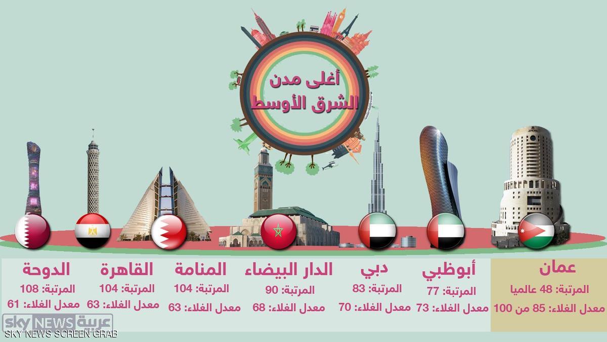 وتلت عمان في غلاء المعيشة على مستوى منطقة الشرق الأوسط وشمال إفريقيا أبو ظبي، ثم دبي، والدار البيضاء، وأبيدجان، ودكار، والمنامة، والقاهرة ثم الدوحة، فيما صنفت مدينتي الرياض وجدة من بين المدن الأقل تكلفة.