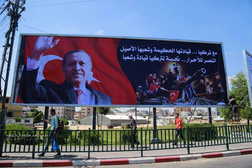 وضعت صباح اليوم الأحد، يافطةً جديدة على مفترق السرايا، أحد أكبر المفترقات وسط مدينة غزّة، وتحتوي اليافطة على صورةٍ للرئيس التركي رجب طيب أردوغان، وعبارات الشكر والتحايا للشعب التركي وحكومته.