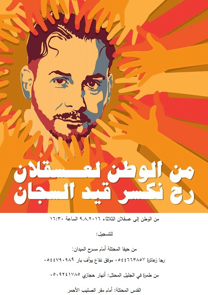 حيث يتجمّع المشاركون بدعوة من الأحزاب الفلسطينية في فلسطين المحتلة عام 48، أمام مسرح الميدان في حيفا المحتلة، يوم الثلاثاء المقبل 9 أغسطس، الساعة (16:30)، وتنطلق المظاهرة إلى مستشفى "برزلاي" في عسقلان المحتلة، ونوّهت الدعوات أنه يتم التسجيل للمشاركة مسبقاً، للعمل على تجهيز الحافلات حسب عدد المشاركين، وتم نشر أرقام للمشاركة من الجليل المحتل، حيث يكون التجمّع في طمرة.