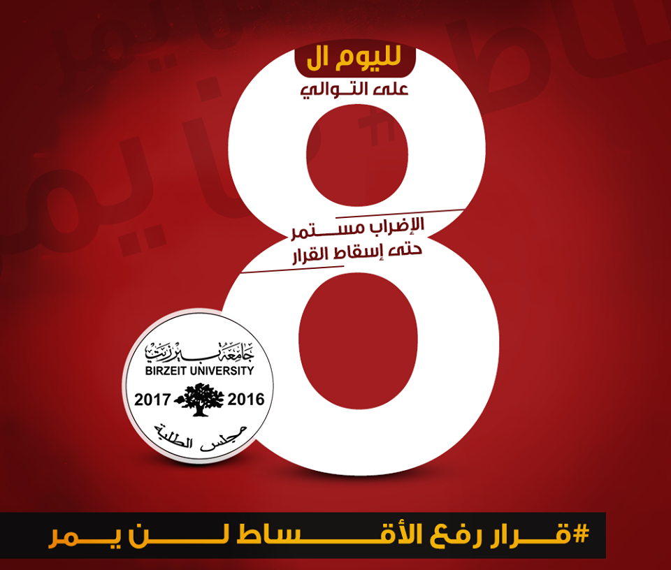 تستمر الحركة الطلابيّة في جامعة بيرزيت برام الله ولليوم الثامن على التوالي في خوض الإضراب الشامل في الجامعة، بعد رفض إدارة الجامعة إسقاط قرار رفع الأقساط الجامعية.