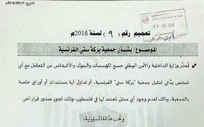 وجاء ذلك خلال تعميم أصدرته الوزارة بشأن تلك الجمعية، مرجعةً ذلك لعدم وجود أي ممثل مُعتمد لها في فلسطين، مشددةً على العمل وفق هذا التعميم إلى حين صدور قرار آخر بشأن الجمعية، مؤكدةً أن الجميع تحت طائلة المسؤولية.