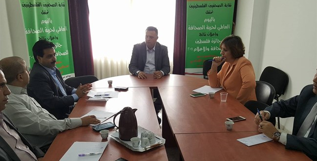 وترأس نقيب الصحفيين ناصر أبو بكر جلسة عقدت في مقر النقابة يوم الاثنين لهذا الغرض وحضرها كل من تحسين الأسطل نائب نقيب الصحفيين، وخلود عساف عضو الأمانة العامة للنقابة ورئيسة تحرير وكالة الأنباء والمعلومات الفلسطينية وفا، وماجد سعيد مدير عام الأخبار في تلفزيون فلسطين، وهيثم عمرو مساعد أمين عام اللجنة الوطنية للتربية والثقافة والعلوم (خبير مالي وإداري)، وأيهم أبو غوش مدير دائرة الاقتصاد في صحيفة "الحياة الجديدة" فيما تغيّب عضو الهيئة العامة للنقابة منتصر حمدان.