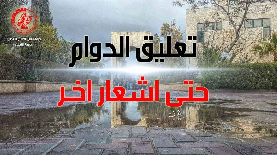 انتفض إطار طلابي في ظل غياب مجلس اتحاد الطلبة والأطر الطلابية الأخرى، فيما كان هذا الإطار هو جبهة العمل الطلابي التقدمية في جامعة القدس، فأعلن عن تعليق الدوام يوم الأربعاء الماضي، الموافق لـ 15/2/2017 ، تغيّبت باقي الأطر ومجلس اتحاد الطلبة في ذلك اليوم، إلى أن استفاقت في اليوم التالي، الخميس، مجلس اتحاد الطلبة وحركة الشبيبة الطلابية و كتلة الوحدة التابعة للجبهة الديمقراطية لتحرير فلسطين – لتعلن تعليقاً عن الدوام راكبة سفينة جبهة العمل الطلابي التقدمية، فاستطاع هذا الاطار أن يُدافع بصدر مفتوح لوحده في ساح الجامعة ثم أن يوجه كافة الأطر الطلابية للالتفاف وإعادة النظر في البوصلة التي يجب أن تكون باتجاه مصلحة الطلبة .. كافة الطلبة.