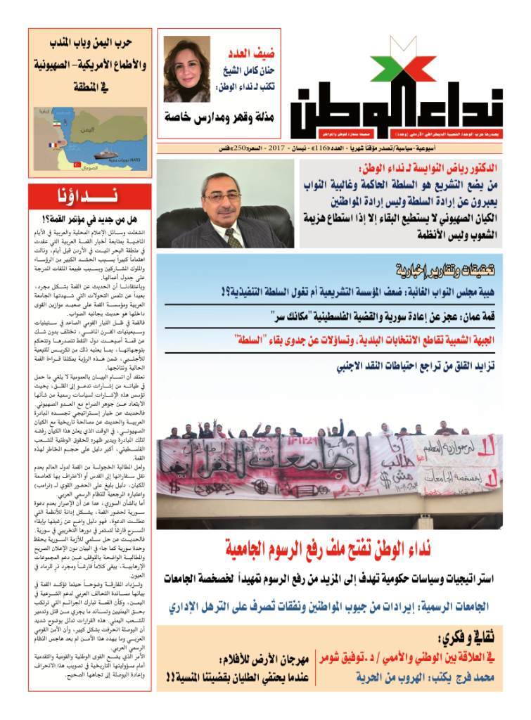 صدر العدد 116 من جريدة نداء الوطن، الصادرة عن حزب الوحدة الشعبيىة الديمقراطي الأردني.