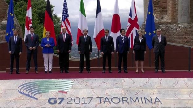 والتقى قادة الدول والحكومات السبع ظهر الجمعة في المسرح الإغريقي المهيب في هذا المنتجع البحري في صقلية لالتقاط صورة جماعية قبل التوجه مشيا إلى مكان القمة.