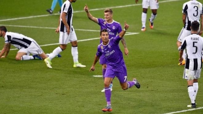 قاد النجم كريستيانو رونالدو، الذي أحرز هدفين، فريقه ريال مدريد ليتوج بطلا لدوري أبطال أوروبا للمرة 12 في تاريخه بعد الإطاحة بمنافسه الإيطالي يوفنتوس الذي أنهى المباراة بـ 10 لاعبين.