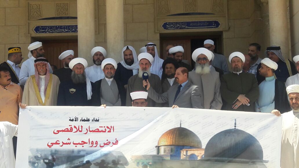وجرى اليوم وقفةً تضامنية نصرة للقدس والأقصى في أكبر مساجد بغداد تقدمها مفتي العراق الشيخ مهدي الصميدعي وشيوخ دار الإفتاء، ولجنة كبار العلماء والمرجعيات الدينية.