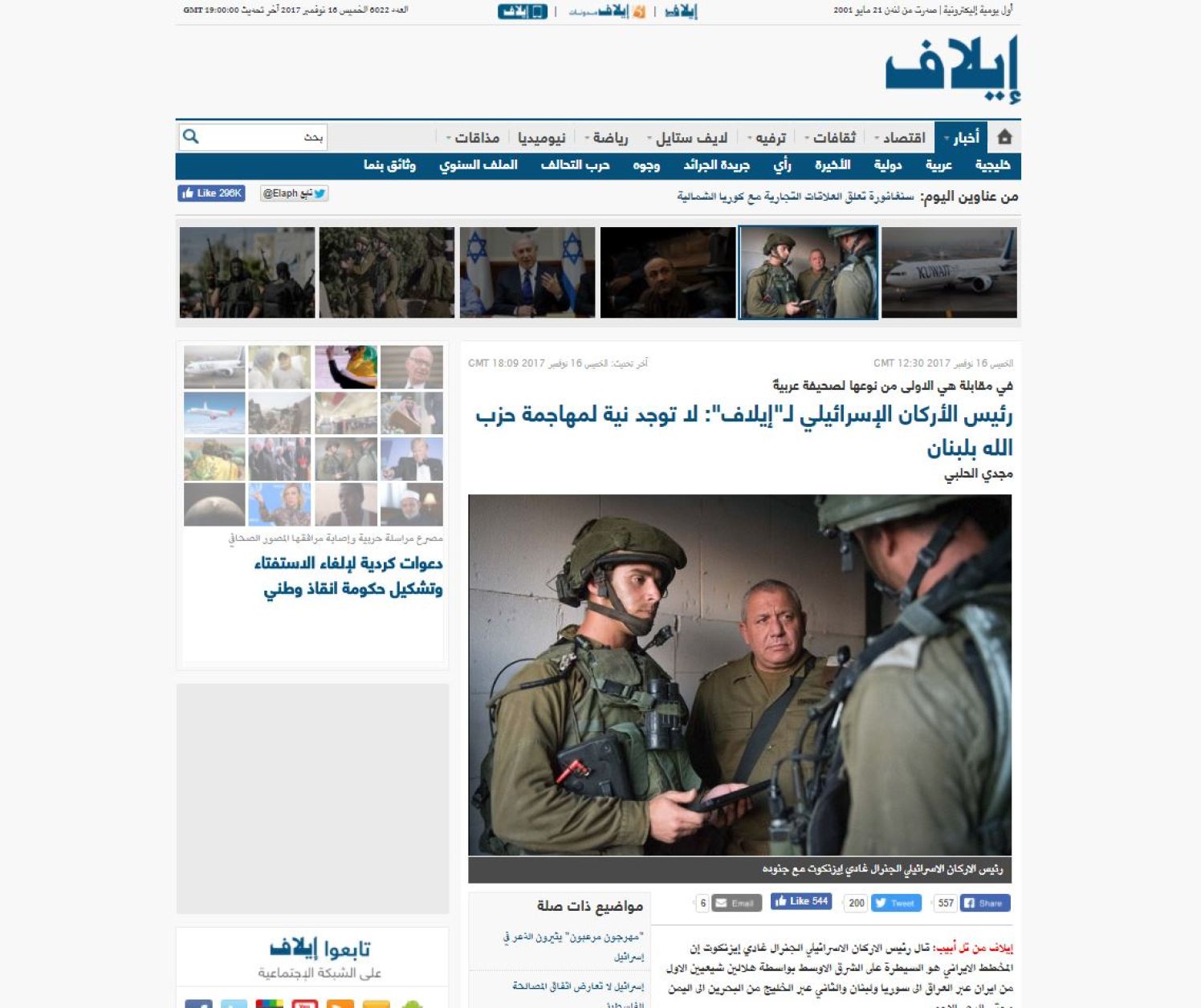 قالت صحيفة هآرتس الصهيونية أن قادة الكيان عندما يريدون التحدث إلى الرياض ف‘ن جريدة إيلاف هي مدخلهم الخلفي. جاء هذا التقرير على خلفية مقابلة أجرتها الصحيفة السعودية، التي مقرها لندن  مع رئيس هيئة الأركان الصهيونية غادي أيزنكوت.وقد سبق لهذا الموقع الأخباري أن أجرى العديد من المقابلات مع مسؤولين صهاينة.