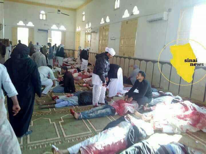 وهاجم مسلحون مسجدا في قرية الروضة التي تبعد نحو 40 كيلومترا غرب مدينة العريش، شمالي سيناء، وأمطروا المصلين أثناء صلاة الجمعة بوابل من الرصاص بعد تفجير عبوة ناسفة.