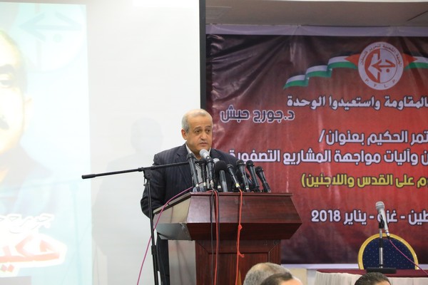 وتابع "مطلوبٌ منّا الانشداد للوطن والشعب قلبًا وروحًا ووعيًا وقولًا وفعلًا، فلا مكان للمتآمرين ولا للمهزومين ولا للفاسدين ولا للمتاجرين بمعاناة شعبنا والراقصين على عذاباته وآلامه. وإذا أردنا الانتصار والوفاء لمسيرة القادة العظام أبي عمار وأحمد ياسين والشقاقي وأبي علي مصطفى وحيدر عبد الشافي وعمر القاسم وسليمان النجاب وأبي العباس، وجورج حبش الذي نُحيي ذكرى رحيله بهذا المؤتمر العلمي الهام، علينا حماية شعبنا في الوطن والشتات، وحماية الانتفاضة والمقاومة والوحدة الوطنية وإنجاز المصالحة وتعزيز الدور الجماهيري، والدعوة لتسريع الحوار الوطني الشامل، وتعزيز مبدأ الشراكة الوطنية وترتيب البيت الفلسطيني الداخلي، وإعادة بناء منظمة التحرير الفلسطينية، على أسس ديمقراطية وبما يُساهم في صوغ استراتيجية مواجهةٍ وطنية على كافة الصعد، وتنفيذ قرارات الإجماع الوطني الخاصة بإنهاء اتفاقيات أوسلو والتزاماتها الأمنية والسياسة والاقتصادية، وسحب الاعتراف بالكيان الصهيوني، وتعزيز صمود أهلنا في القدس، ومواجهة المخططات الصهيونية التي تستهدفها".