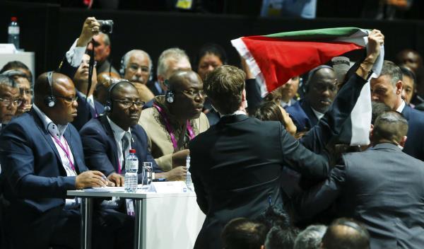 تعطلت أعمال كونجرس الاتحاد الدولي لكرة القدم (الفيفا) اليوم الجمعة لفترة قصيرة بعد أن دخلت سيدتان قاعة مقر الجمعية العمومية الخامسة والستين للفيفا بمدينة زيوريخ السويسرية وهتفتا بشعارات ولوحتا بالعلم الفلسطيني، قبل أن يتدخل الأمن لإبعادهما.