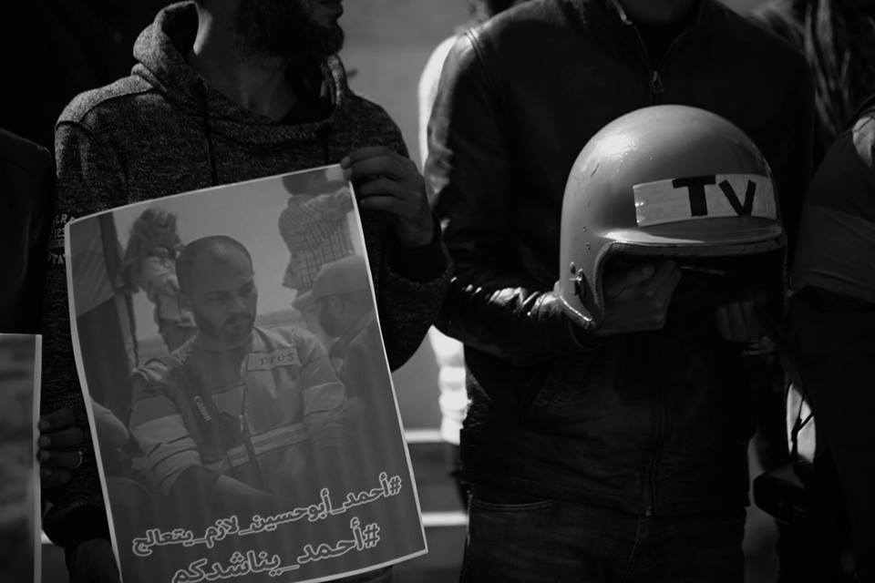 نظَّمت نقابة الصحفيين الفلسطينيين، مساء اليوم الأحد، وقفة في المستشفى الاندونيسي شمال قطاع غزة بمُشاركة عشرات الصحفيين والأطر الصحفية للمُطالبة بوقف عرقلة الاحتلال لسفر الزميل الصحفي أحمد أبو حسين للعلاج والذي أصيب بجراح خطيرة يوم الجمعة الماضي برصاص الاحتلال شرق غزة.