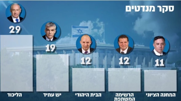 وقد فحص الاستطلاع سيناريوهين اثنين الأول الأحزاب في وضعها القيادي الحالي، حيث يحافظ "الليكود" على مكانه في المقدمة، بـ29 مقعدا، ويليه "هناك مستقبل" بـ19 مقعدا، ثم "البيت اليهودي" والقائمة المشتركة بـ 12 مقعدا لكل منهما وبعدهما فقط يأتي المعسكر الصهيوني بـ 11 مقعدا ويليه "يهودية التوراة" بـثمانية مقاعد وميرتس وكولانو بسبعة لكل منهما وأخيرا "إسرائيل بيتنا" و"شاس" بخمسة مقاعد. وقد أظهر الاستطلاع أيضا أن التحالف الحالي ستزداد قوته بمقعدين لو أجريت الانتخابات الآن.