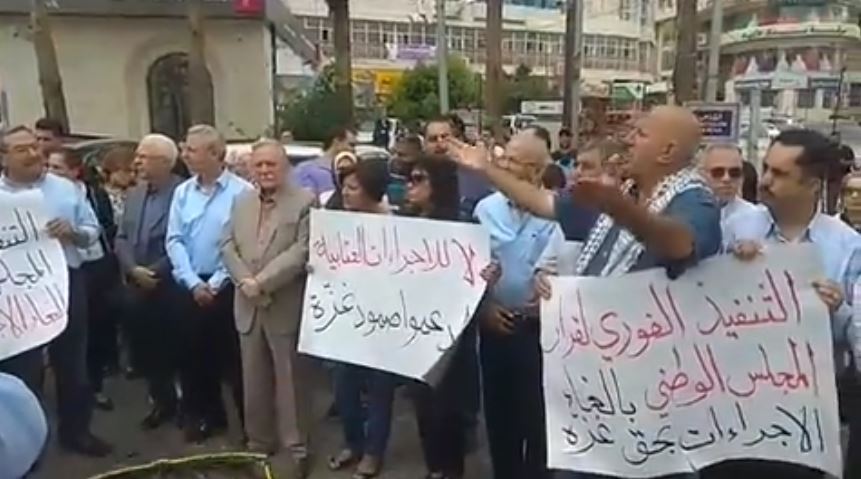 ورفع المشاركون لافتات كُتب عليها "التنفيذ الفوري لقرار المجلس الوطني بإلغاء الإجراءات بحق غزة"، و"لا للعقوبات..ادعموا صمود غزّة"، وهتفوا مُطالبين بإنهاء الانقسام.