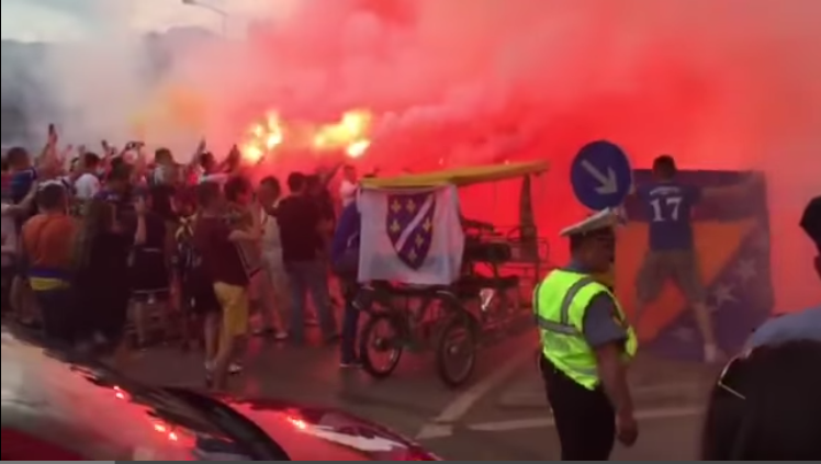وألقى المتظاهرون البوسنيون قنابل دخانية وألعاباً نارية تجاه الفندق، معبرين عن مساندتهم للشعب الفلسطيني، حيث فرقتهم قوات الأمن بعد اعتراضهم على تواجد المنتخب الإسرائيلي على الأراضي البوسنية، ما دفع شرطة البلاد لإخلائه.