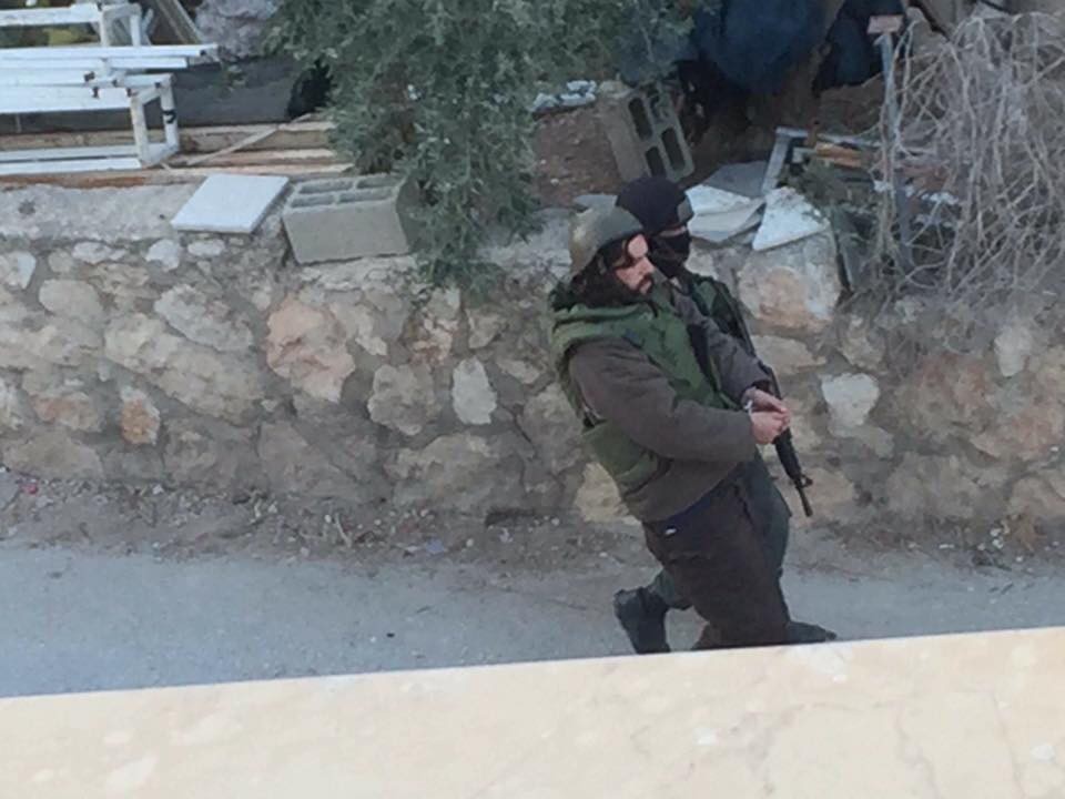 جنود الاحتلال وهم يقتادون الأسير حسن مُكبلًا وبلباس الجيش لخداع وتمويه الأهالي خلال عملية الاقتحام