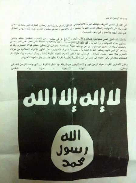 وزع بيان مزعوم منسوب لـ "داعش في القدس الشرقية أول أمس الخميس .