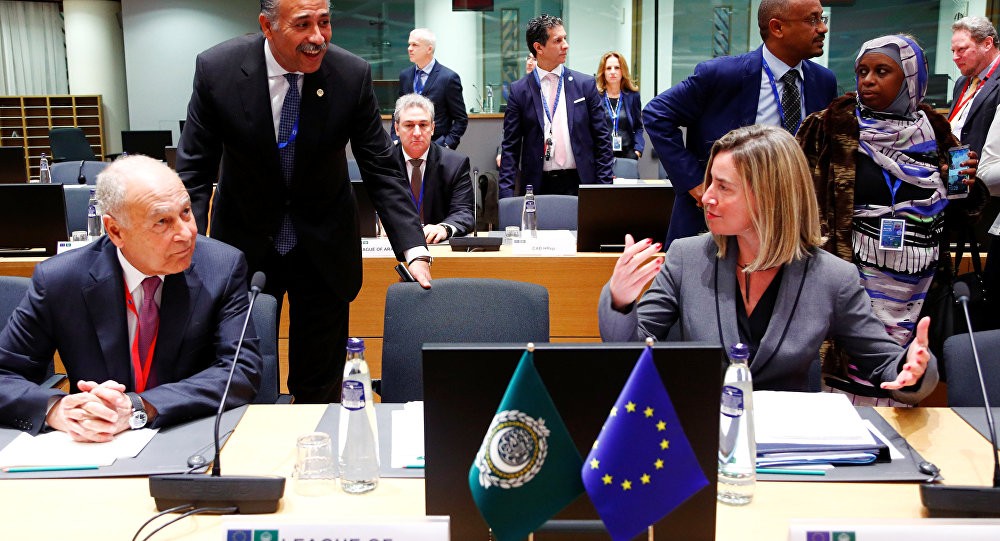 مسؤولة الخارجية في الاتحاد الأوروبي فدريكا موغريني ورئيس الجامعة العربية أحمد أبو الغيط