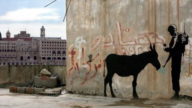 وعن لوحتيّ فنان رسومات الشوراع، فإن إحداها موجودة على جدار بمدينة بيت لحم وسط الضفة المحتلة بفلسطين، و أطلق عليها اسم "وثائق حمار"، وهي لوحة ساخرة، تظهر حماراً يفتشه جندي "إسرائيلي"، رسمت عام 2007، على جدار الفصل العنصري الذي يقسّم أرض الوطن.