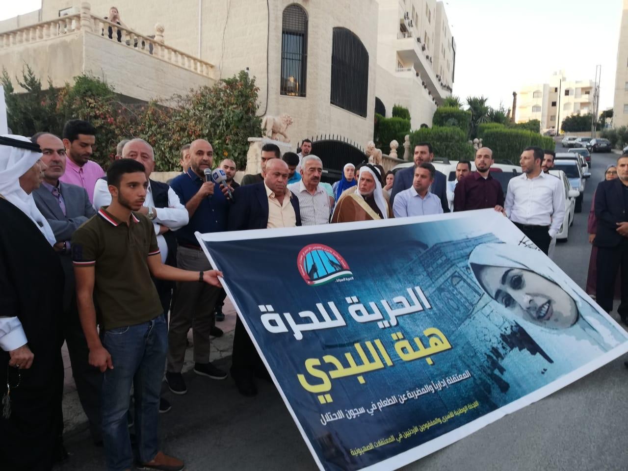 شاركت شخصيات وطنية وحزبية وبرلمانية أردنية، مساء اليوم الاثنين، في عمَّان، بوقفة تضامنية مع الأسيرة هبة اللبدي المُضربة عن الطعام في سجون الاحتلال الصهيوني لليوم (15) على التوالي.
