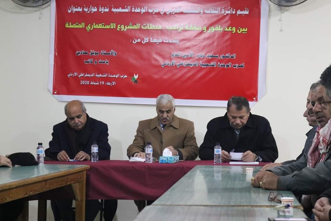 أقامت دائرة الثقافة والتثقيف الحزبي في حزب الوحدة الشعبية ندوة تحت عنوان "بين وعد بلفور وصفقة القرن، الأربعاء 19 فبراير، في مقر الحزب الرئيسي في عمّان، تحدث فيها كل من: د.سعيد ذياب الأمين العام للحزب ود.موفق محادين الباحث والكاتب الأردني، وأدار الندوة د.عارف حمو عضو الدائرة.