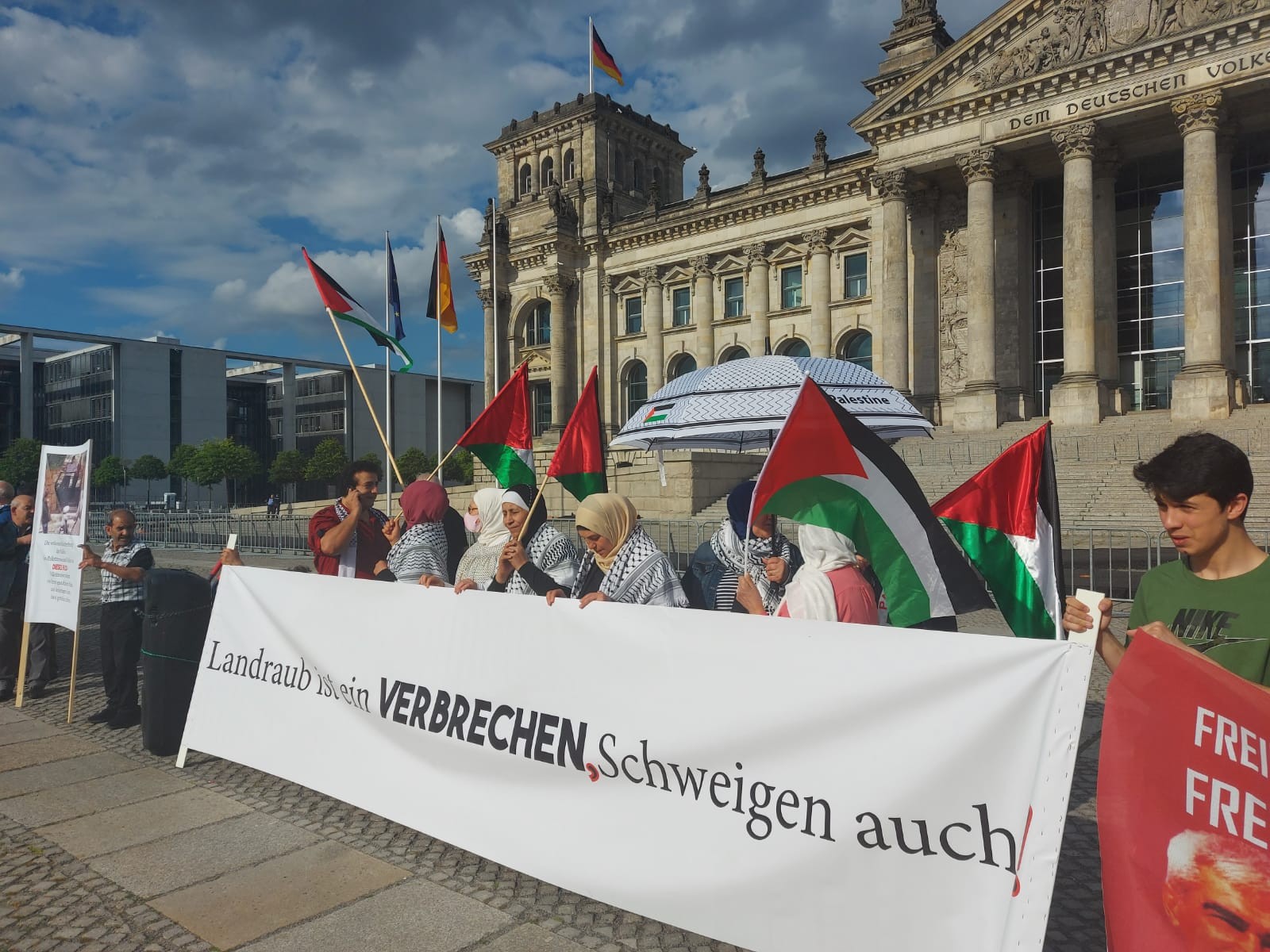 نظّمت شبكة صامدون اليوم الجمعة، وقفة احتجاجية أمام البرلمان الألماني في العاصمة الألمانية برلين، وذلك رفضًا لمُخططات الضم الصهيونية وسرقة ومصادرة وإحتلال الأراضي الفلسطينية، وتدمير المنازل ومشاريع التصفية الإستعمارية من قبل الإحتلال الصهيوني.