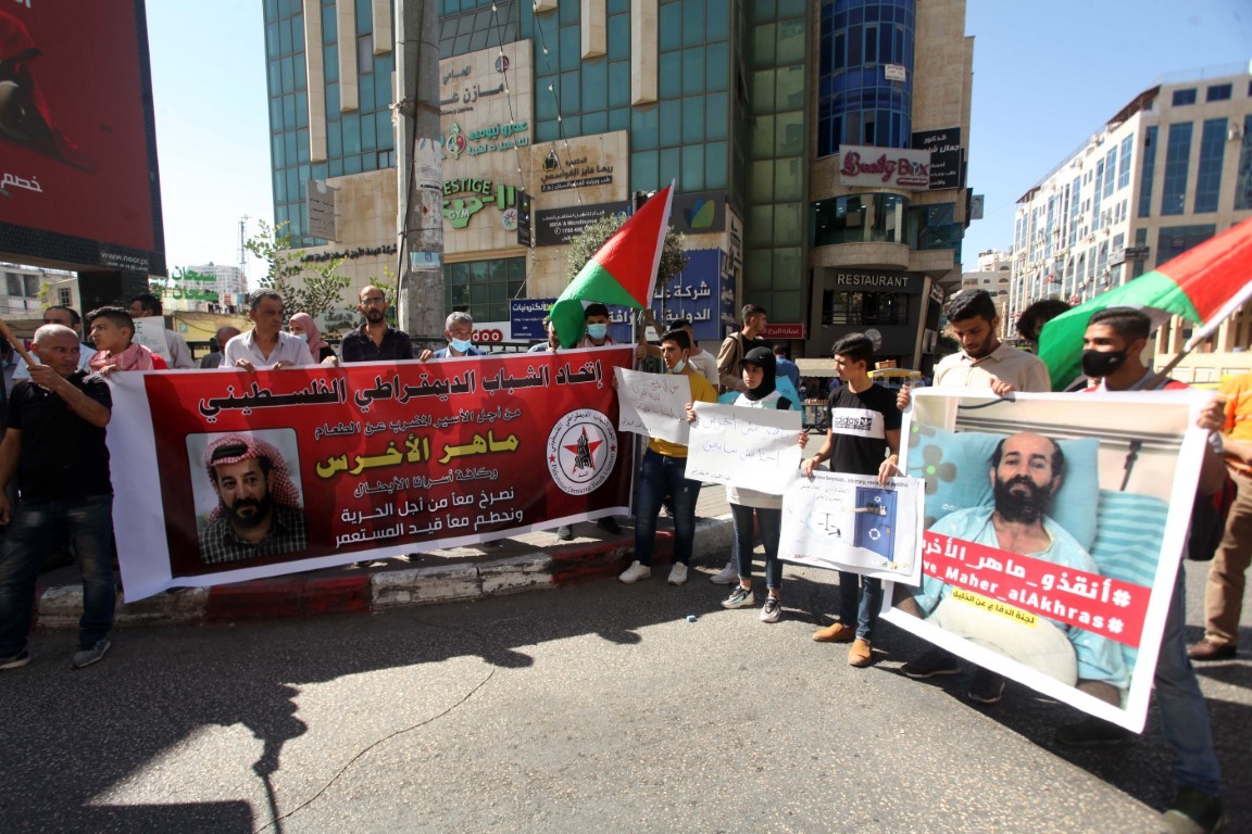 طالب مشاركون في اعتصام إسنادي مع الأسير المضرب عن الطعام ماهر الأخرس، اليوم الأربعاء، المؤسسات الدولية تحمل مسؤولياتها من أجل إنقاذ حياته.