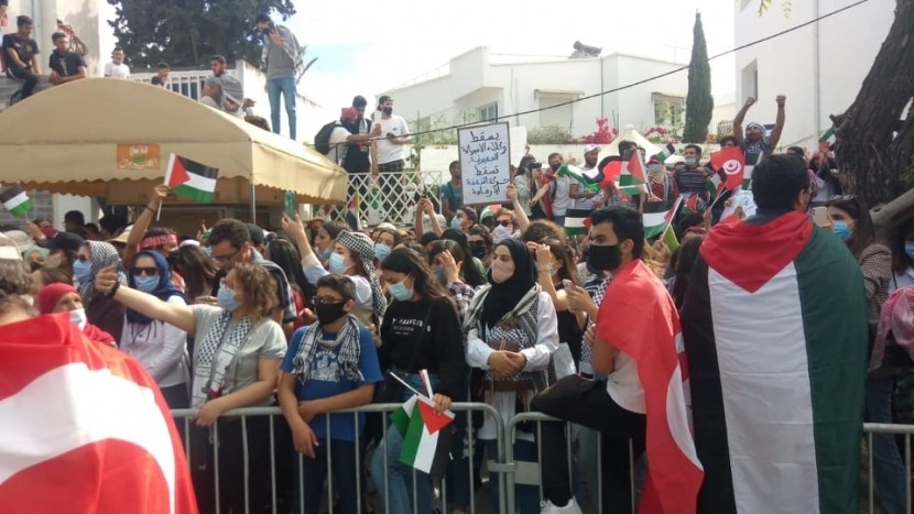 ورُفعت خلال التظاهرات، التي جاءت تلبية لدعوة أحزاب ومنظمات مجتمع تونسي يتقدمهم اتحاد الشغل، أعلام فلسطين وتونس.