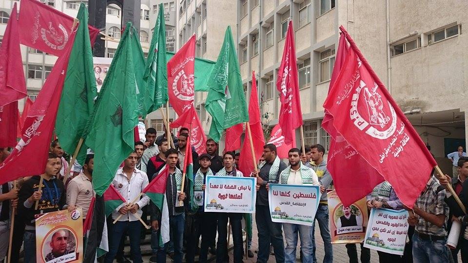 نظمت جبهة العمل الطلابي التقدمية والكتلة الإسلامية بجامعة الأزهر بغزة، صباح اليوم، وقفة تضامنية عُنونت بـ"انتفاضة شعبنا هبة الكرامة لانتزاع الحق"، في ساحات الجامعة "الكُليّات العلمية"، دعماً وإسناداً للانتفاضة الشعبية التي سطّر حروفها الشباب الثائر الحُر.