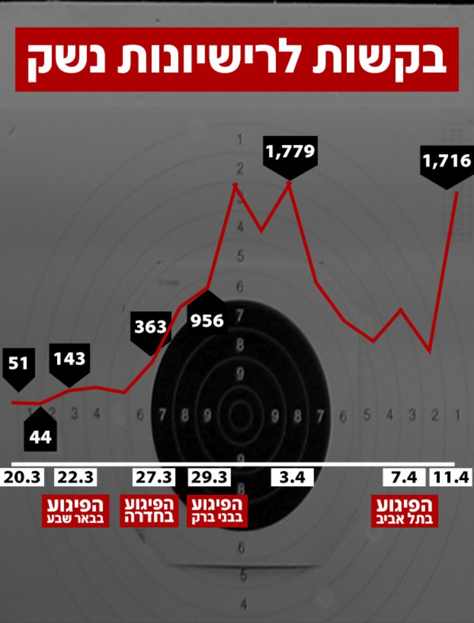 ففي يوم 20 آذار / مارس مثلا، تم إصدار 51 طلبًا للحصول على رخصة حيازة أسلحة نارية، و في اليوم التالي، كان هناك 44 طلبًا من هذا القبيل. و منذ ذلك الحين، كان هناك ارتفاع سريع في عدد الطلبات، بالتوازي مع تواريخ العمليات الفدائية: لقد زاد الهجوم في بئر السبع بالفعل عدد الطلبات إلى 143 يوميًا ، بعد هجوم الخضيرة ارتفع إلى 363 ، وقفز الرقم بعد الهجوم على بني براك إلى 956، واستمر الصعود من بين بضع عشرات ومئات من طلبات الحصول على ترخيص حيازة أسلحة، وصل العدد إلى ما يقرب من 1800 في 3 نيسان/أبريل ، بعد عملية بني براك.