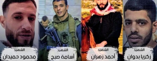 نعت كتائب الشهيد أبو علي مصطفى الجناح العسكري للجبهة الشعبية لتحرير فلسطين، اليوم الأحد، شهداء القدس وجنين الخمسة الذين أرتقوا في اشتباكات مسلحة مع قوات الاحتلال فجر اليوم. وأكَّدت الكتائب في بيانٍ