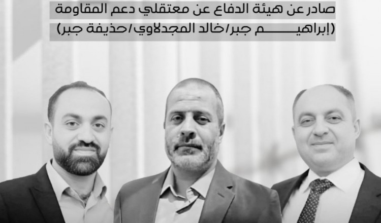 أصدرت هيئة الدفاع عن معتقلي دعم المقاومة بياناً يدعو إلى إخلاء سبيل المعتقلين الثلاثة إبراهيم إبراهيم جبر وحذيفة جبر وخالد المجدلاوي، والتجاوب مع الوساطات السياسية لإغلاق الملف لأبعاده السياسية، ويواج
