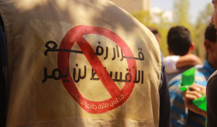 انطلق طلاب جامعة بيرزيت في تظاهرة أمام مقر مجلس الوزراء في رام الله، اليوم الأحد 4 أيلول، احتجاجاً على تنصّل الحكومة من دفع مستحقات الجامعة، ما دفع الجامعة لتحويل المشكلة على الطالب، ودفعها بقرار رفع أقساط الطلبة بقيمة دينارين على الطلبة القد
