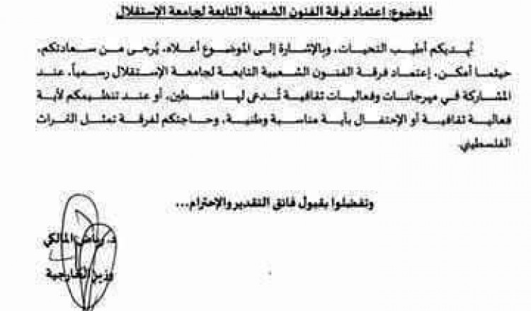 أثار حفيظة مجموعة كبيرة من الفرق الفنيّة والمؤسسات الثقافيّة في فلسطين، تعميم أصدرته وزارة الخارجيّة الفلسطينيّة برام الله، للسفارات والممثليّات الفلسطينيّة في العالم، يقضي باعتماد فرقة الفنون الشعبيّة التابعة لجا