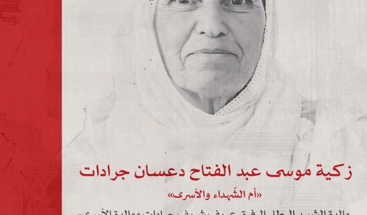 نعت الجبهة الشعبية لتحرير فلسطين بكل معاني الوفاء والعهد المناضلة زكية موسى عبد الفتاح دعسان جرادات، 71 عاماً، مواليد القدس، والدة الشهيد البطل الرفيق عريف شريف جرادات ووالدة الأسرى، التي رحلت يوم 5 ف